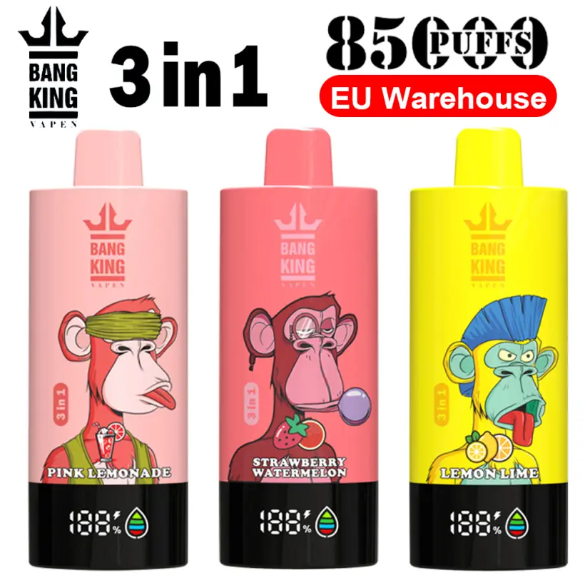 Bang King 85k Puffs liefert ein ultra-lang anhaltendes 3-in-1 Einweg-Vape mit bis zu 85.000 Zügen, betrieben von einem 600-mAh-Akku und einer 1,0Ω Mesh-Spule für stabilen, intensiven Geschmack. Mit Type-C Schnellladung und 12 beliebten Geschmacksrichtungen ist es für ganztägige Leistung und Komfort konzipiert. Verpackt zu 10 Stück pro Box und 200 Stück pro Karton, bietet Bang King 85k Puffs Fabrikpreise, EU-Lagerbestand und schnellen kostenlosen Versand für Groß- und Einzelhandelskunden.