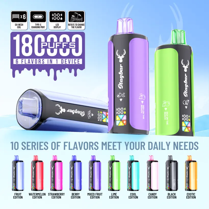 Stagbar 180k Puffs Einweg Vape mit 6-in-1 Design, 1000mAh Batterie, 6×18ml E-Liquid, 1,1Ω Mesh Coil, Type-C Laden. EU Lager, Großhandel, kostenloser Versand, intensive Geschmacksrichtungen.